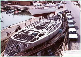 Qui sopra: vista del Moro II nel cantiere di Pesaro, la realizzazione è stata effettuata dal cantiere Yachts officine. Lo scafo è in alluminio e la coperta in kevlar-carbonio.